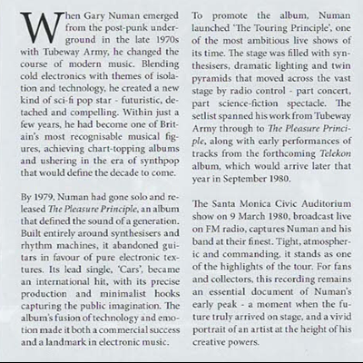 To promote the album, Numan launched ‘The Touring Principle’, one of the most ambitious live shows of its time. The stage was filled with synthesisers, dramatic lighting and twin pyramids that moved across the vast stage by radio control - part concert, part science-fiction spectacle. The setlist spanned his work from Tubeway Army through to The Pleasure Principle, along with early performances of tracks from the forthcoming Telekon album, which would arrive later that year in September 1980.
